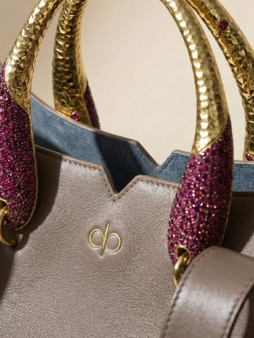 - Hardware: Thateraesque brass, casted, sculpted, hand-hammered, polished and adorned with lab-grown rubies with intricate filigree details.